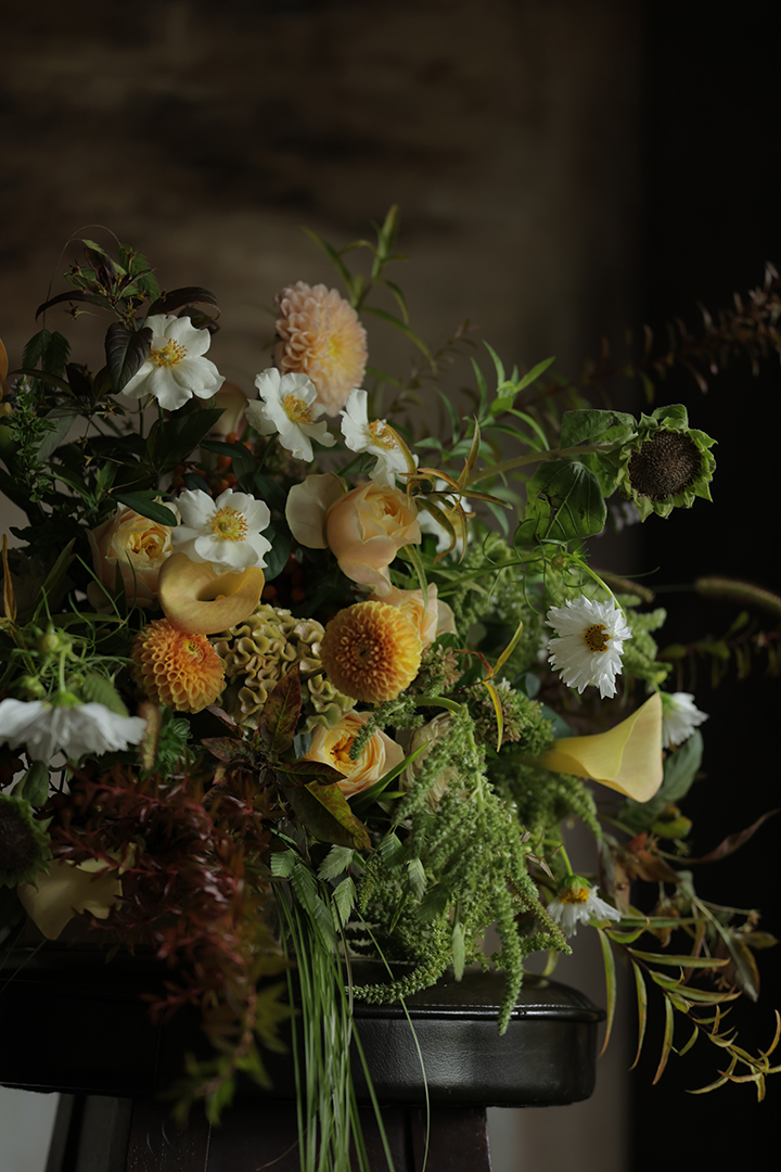また、ブーケに入っているチョウジソウも、この時期には完全には黄葉しておらず、緑から黄への移り変わりが季節の曖昧さの表現に欠かせません。