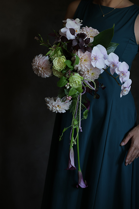 洋ランや個性的な葉ものを使ってリニアスタイルのブーケ作りを目指します。